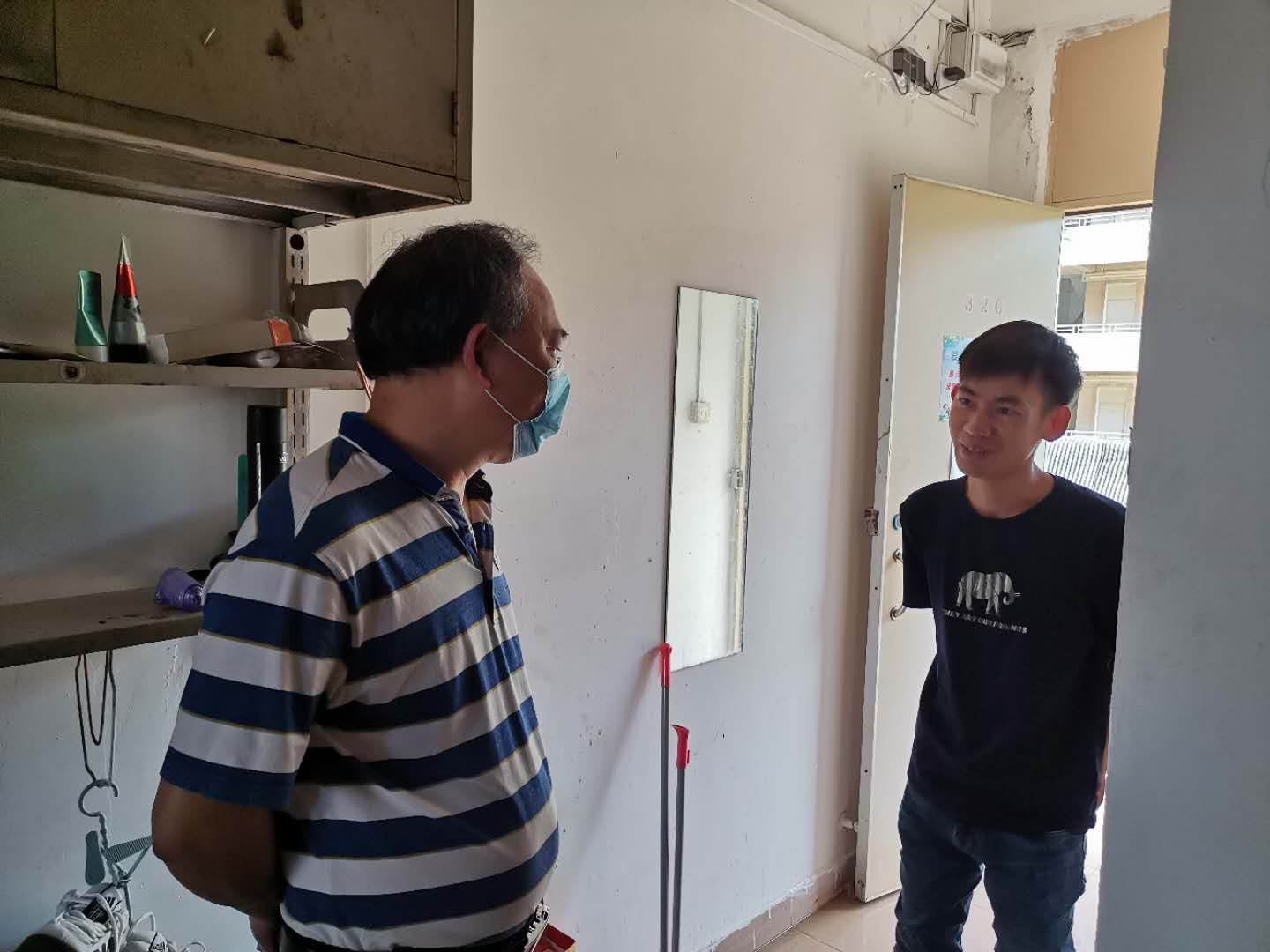 在研究生宿舍,邓伟强和研究生亲切交谈,关心学生在防疫物品、生活、学习等方面情况,并要求学生一定要严格按照888集团