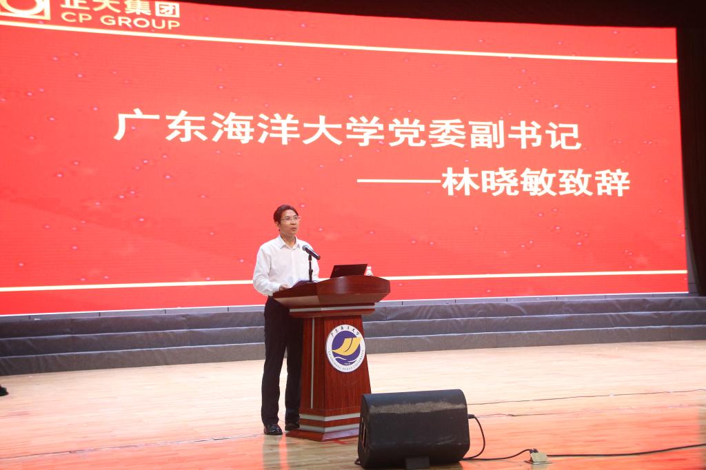 的党委副书记吴少文、辅导员代表、拟参加正大全产业链班和双创大赛150多名本科生、参与现代农业创新与乡村振兴战略课题组的共70多名研究生。正大集团出席人员有:正大集团农牧食品企业中南区广东顾昝副总裁、卜蜂水产(阳江)有限公司兼广东正大生物科技有限公司总经理马志红、广东湛江正大水产有限公司总经理姚俊、中南区广东人事总监郭峻宇、中南区水产事业李有庆资深副总裁、正大集团中南区MBA班65名学员,正大集团特邀嘉宾等近300人出席启动仪式。