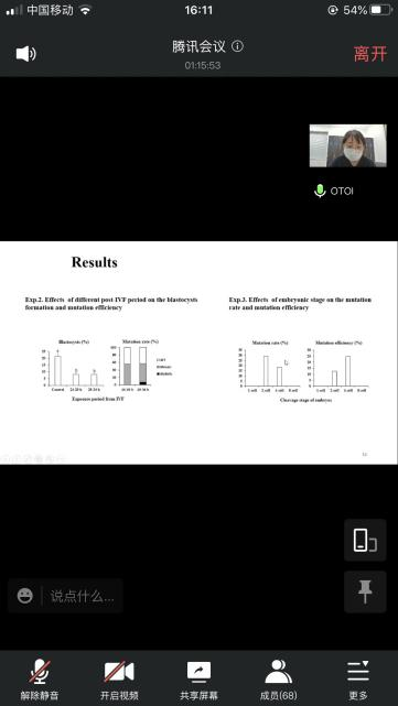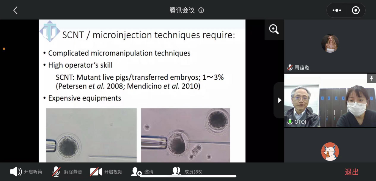 师生作了题为“基因编辑技术在动物中的应用:通过基因编辑生产转基因猪技”和“利用脂质转染试剂的基因编辑新方法”的线上学术报告。动物医学专业和动物科学专业的教师、研究生、本科生90余人聆听了报告,本次报告会由动医系系主任巨向红教授主持。音井威重教授和林青怡博士讲述了动物基因编辑技术发展历史及现状,结合自己研究内容对有关抗病育种为目的的转基因猪的生产技术现状进行了深刻的分析。音井威重教授和林青怡博士的报告深入浅出,内容前沿,令大家耳目一新、受益匪浅。报告结束后,音井威重教授与参会师生进行了深入的交流,师生十分踊跃地向日本专家提出问题,并得到了精彩解答。