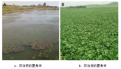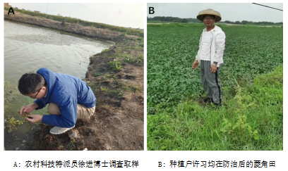 科技服务团队迅速制定防治方案,采用调控水肥,物理防治加化学防治相结合的方法,解决了水面施药效果差的难题,为种植户挽回了经济损失。
