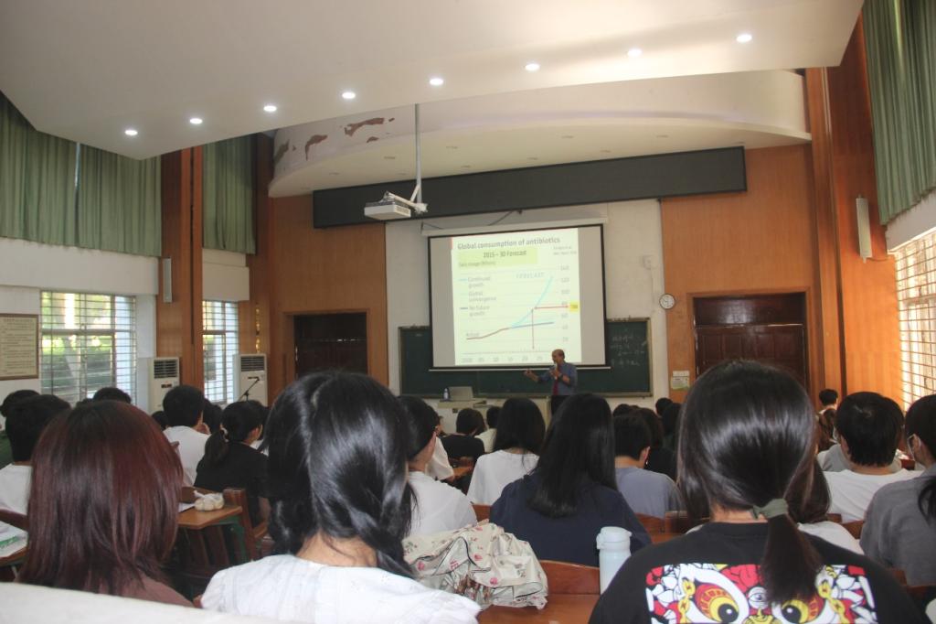 师生作学术报告。Ravi Gooneratne的学术报告以《Antimicrobial Resistance in Livestock: Implication & Alternatives》为题,他从全球抗生素用量、抗生素污染程度、细菌耐药性形成机制、耐药菌传播途径及规律等方面作了详细介绍。Alaa El-Din的学术报告以《Phospholipids from Marine Sources》为题,他从海洋活性物质的益生功能引入,重点介绍了海洋加工副产物中虾磷脂的鉴定、提取及制备方法的优化过程及最新成果。动物医学系和动物科学系部分青年教师、研究生及“卓越班”学生约150参加会议,报告会由动物医学系主任巨向红教授主持,888集团