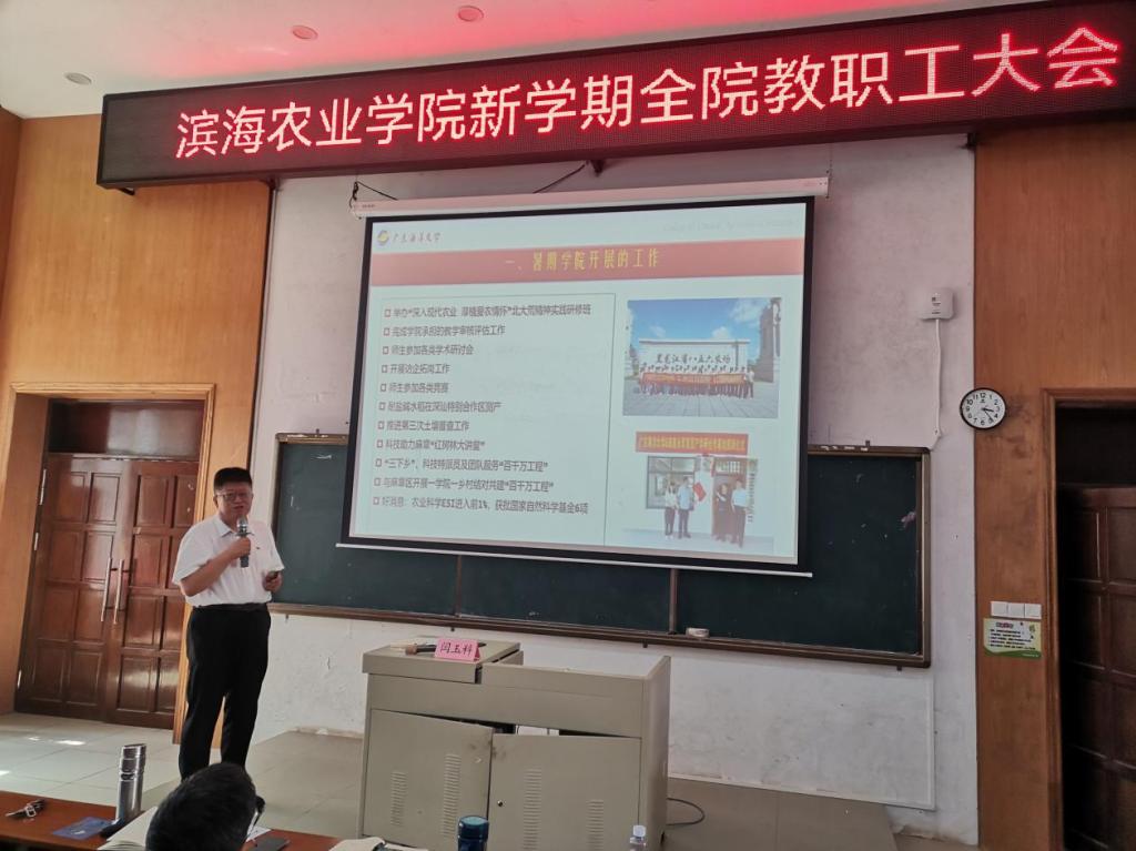 郑殿峰总结了暑期开展的“深入现代农业 厚植爱农情怀”北大荒精神实践研修班、访企拓岗工作、耐盐碱水稻在深汕特别合作区测产等工作,带领全院教职工学习了888集团