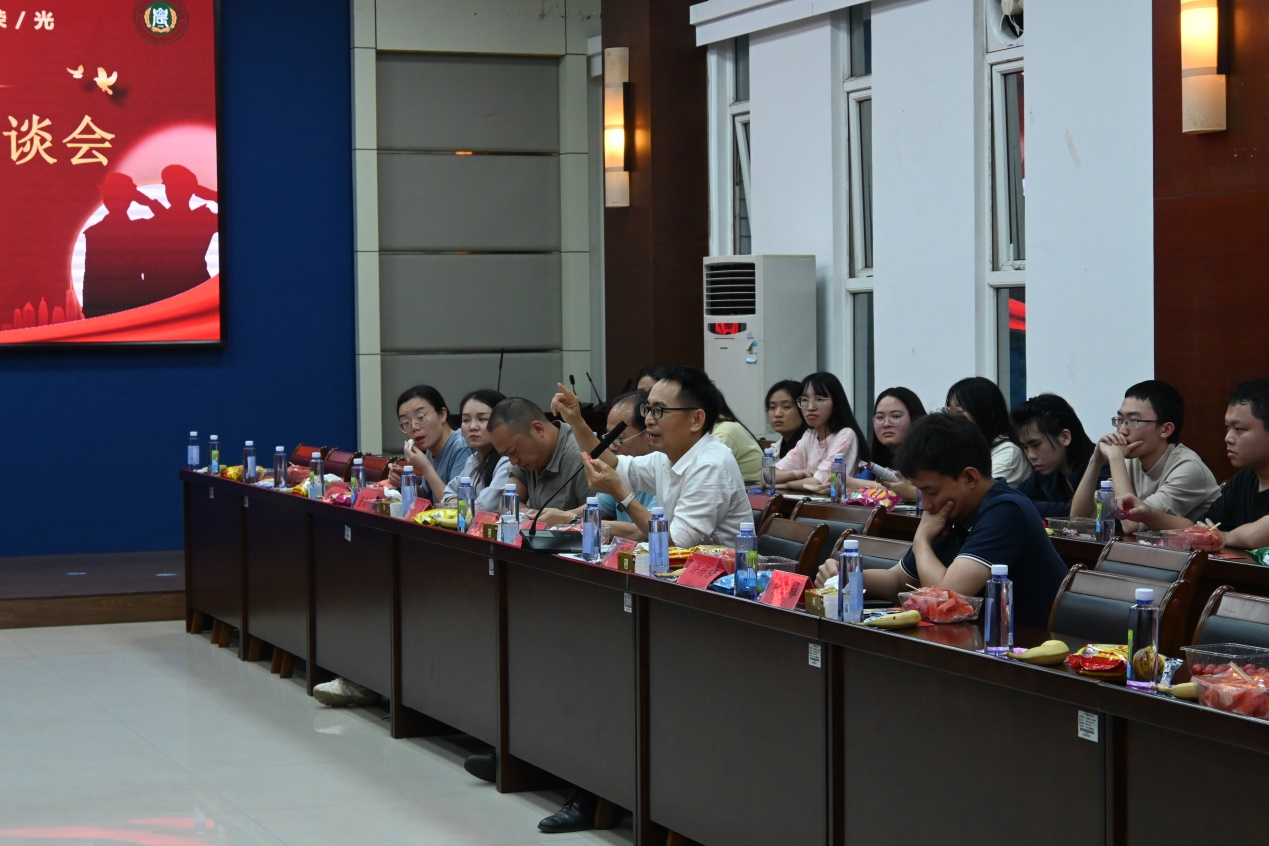 兼职武装干部董海芹、各系辅导员老师,退役大学生、在校各系学生代表共70余人参加本次座谈会。会议由退役学生服务队班长黎永乐主持。