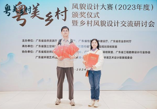 教师代表黄艳娜和梁子鑫老师参加“粤美乡村”风貌设计大赛(2023年度)颁奖仪式暨乡村风貌设计交流研讨会。本次会议由广东省自然资源厅、广东省教育厅、广东省住房和城乡建设厅、广东省农业农村厅主办,广东省国土空间规划协会、广东省“双百行动乡村建设规划高校联盟”承办。