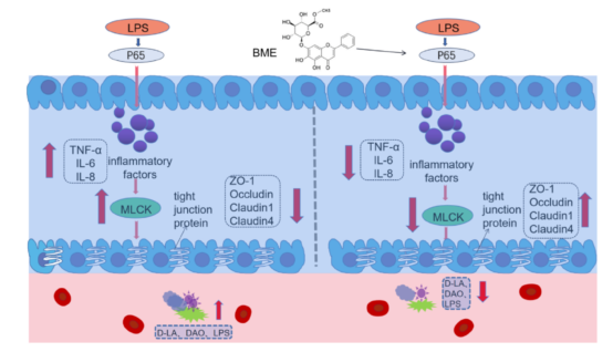 肠道屏障可以防止病原体、内毒素等有害物质进入体内,故肠道屏障的完整性对肠道内稳态和健康至关重要。在肠道屏障受损后,有害物质可易位进入血液,破坏机体健康。作为黄芩苷的一种酯化物,黄芩苷甲酯改善肠道屏障的功能及分子机制尚不清楚。本研究发现,在小鼠体内外条件下,细菌内毒素刺激使肠道释放了大量炎性因子如肿瘤坏死因子TNF-α,造成肠道炎症反应并破坏肠道黏膜屏障,而预处理黄芩苷甲酯可有效抑制促炎细胞因子的表达,通过上调紧密连接蛋白ZO1等的表达保护肠黏膜屏障。在体外条件下,运用酶联免疫吸附(ELISA)和蛋白免疫印迹(WB)等技术发现高表达的TNF-α可上调肌球蛋白轻链激酶(MLCK)与紧密连接ZO1蛋白的比值(即MLCK/ZO1蛋白表达),接着用免疫沉淀-蛋白免疫印迹技术(IP-WB)证实黄芩苷甲酯能够与TNF-α的上游P65蛋白发生直接结合。本文证实了黄芩苷甲酯可通过P65/TNF-α/MLCK/ZO-1信号通路改善肠道屏障功能,这为后续开发预防畜禽肠道屏障损伤的兽用中药和饲料添加剂的调控策略提供了新方向。