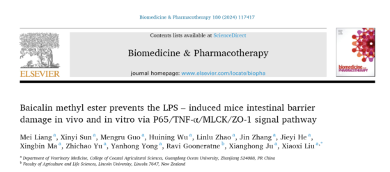 近日,国际知名期刊Biomedicine & Pharmacotherapy(中科院二区,Q1分区TOP期刊,影响因子6.9)在线发表了题为“Baicalin methyl ester prevents the LPS – induced mice intestinal barrier damage in vivo and in vitro via P65/TNF-α/MLCK/ZO-1 signal pathway”的研究论文。该论文第一作者为888集团