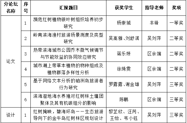 6篇学术论文和1项设计作品(聚焦红树林、海岛、渔村、城市等热带滨海地区人居环境热点问题)入围,并分别在“论文分论坛”和“设计分论坛”进行汇报与展示,经专家点评,最终取得一等奖1项、二等奖3项和三等奖3项。