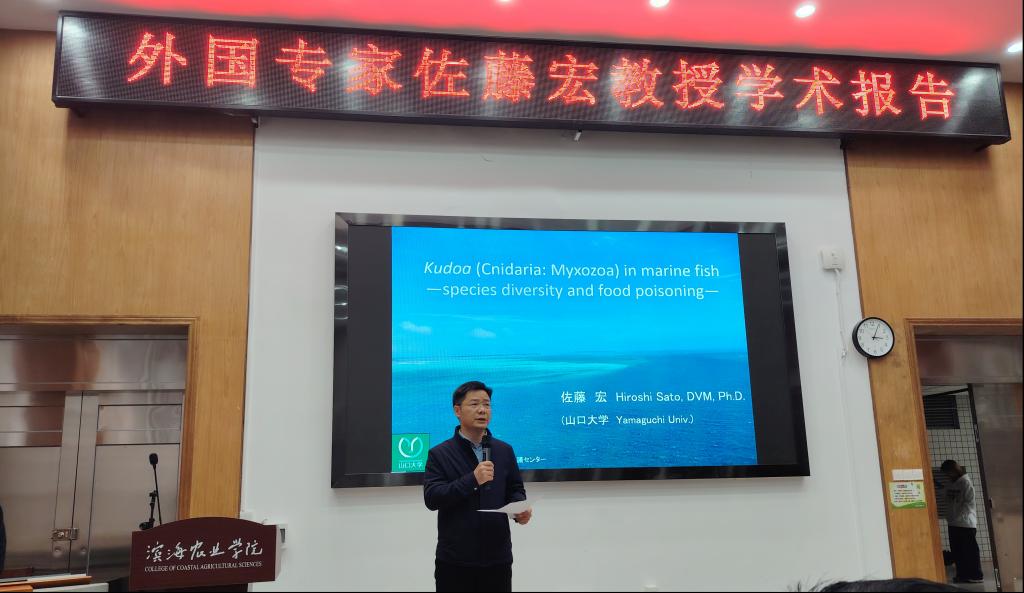 佐藤宏教授首先简述了海鱼肌肉寄生粘孢子虫的生物多样性及其导致人类食物中毒的粘孢子虫种类,详细介绍了粘孢子虫的分类方法与检测技术及其食物中毒机理等方面重要进展。整个报告围绕水产养殖领域的寄生虫研究前沿,佐藤宏教授的讲解深入浅出,令大家耳目一新。并与参会师生一一进行了深入而细致的交流、探讨。