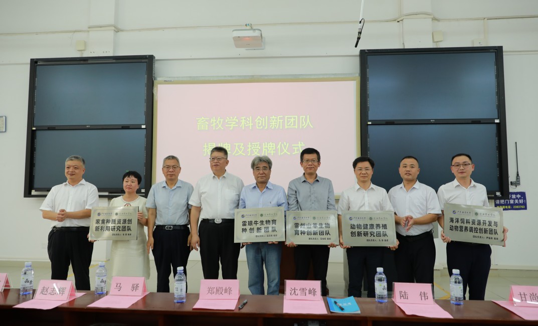 创新团队揭牌仪式由刘文超副院长主持。郑殿峰书记在致辞中指出,经过67年建设与发展,畜牧学学科已形成显著优势:连续两年入选“软科中国最好学科排名”“动物遗传育种与繁殖”学科获批广东省特色重点学科并设立“珠江学者”岗位。新组建的雷州山羊生物育种、雷琼黄牛生物育种、家禽种质资源创新、海洋饲料资源开发和动物健康养殖创新团队,聚焦学科发展前沿,为博士点申报和学科建设注入新动力。他热切希望老师们勇担使命,在畜禽种源核心技术攻关上实现突破,加强地方优良品种资源保护与开发利用,培育出更多高产、优质、高效、抗病的畜禽新品种,加强团队之间的协作,推动产学研深度融合,服务当地畜牧业,助力乡村振兴。随后,郑殿峰书记和马驿院长共同为畜牧学学科五大创新团队揭牌。