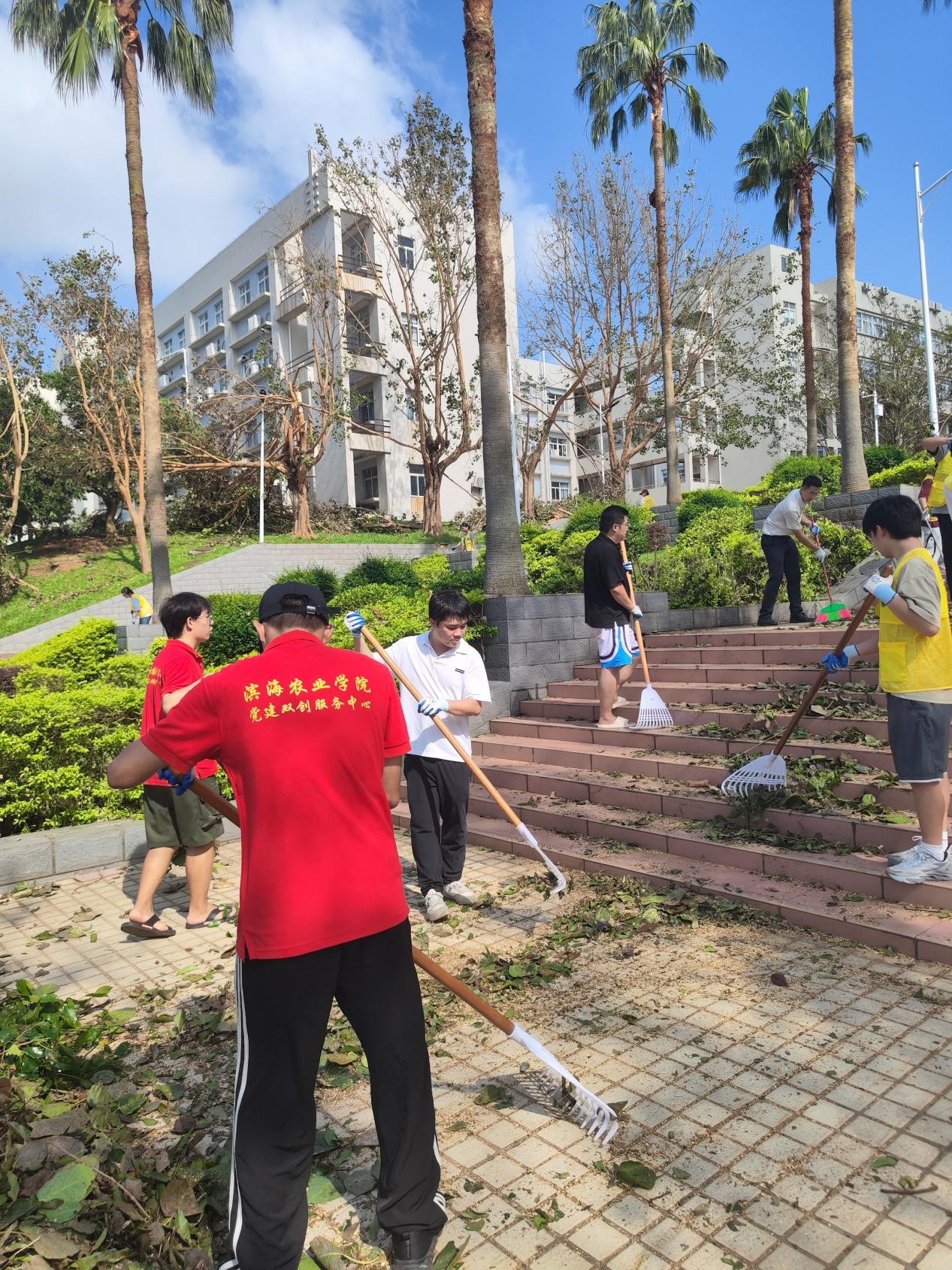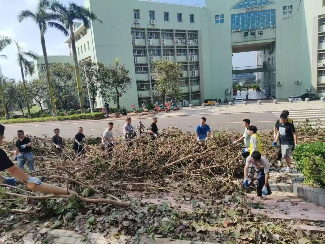 的林果楼和农研所,师生们细致清理缠绕在实验作物上的断枝并将大量散落的断枝都清理到固定地点,尽可能减少台风对教学实践基地的影响。汗水顺着脸颊滑落,浸湿了衣领,但当看到校园逐渐恢复整洁,师生们的脸上都露出了欣慰的笑容。“和老师、同学们一起为校园出力,不仅是劳动,更是一堂生动的‘责任教育课’。
