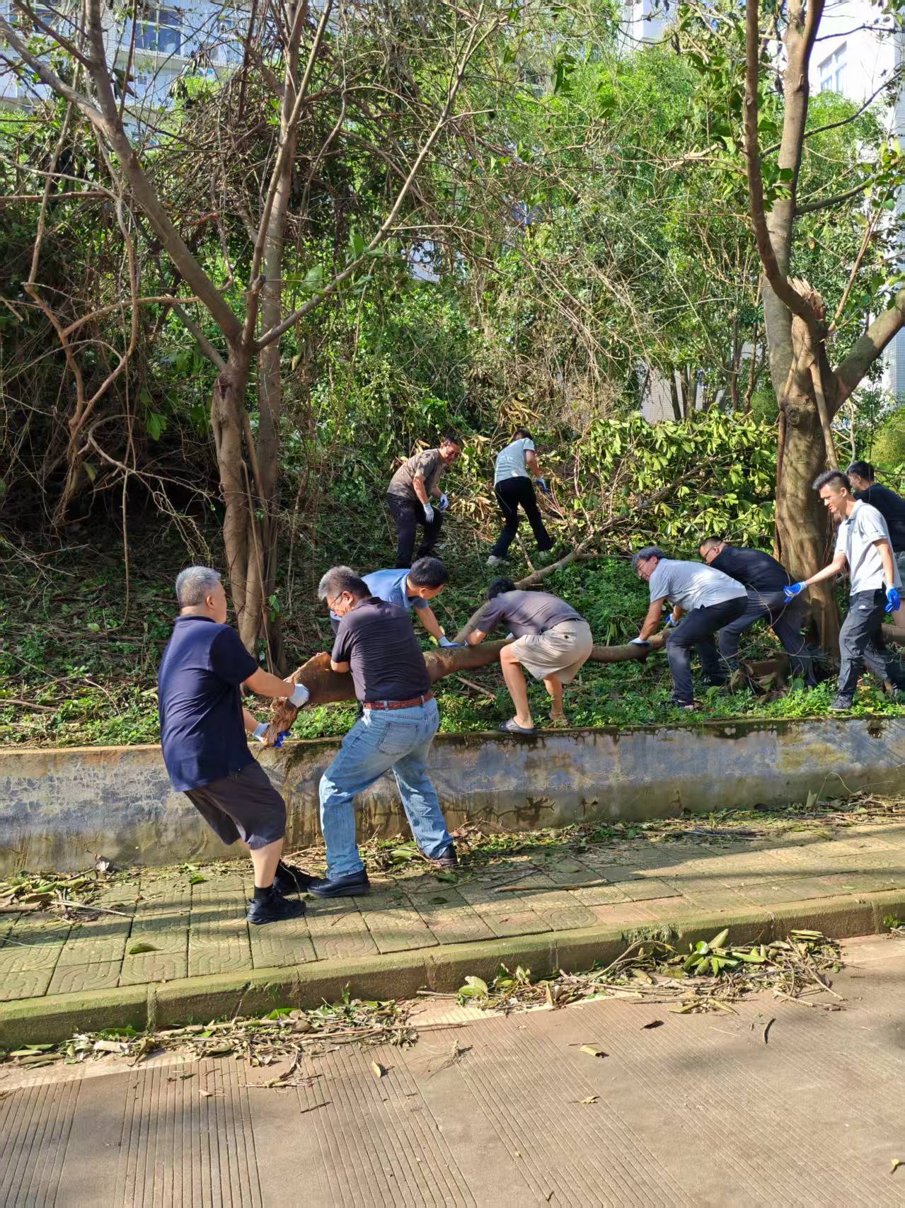 负责区域。面对拦路的倒伏大树,大家合力搬运沉重树段,分工协作打通 “交通梗阻”;针对主干道和兴农楼周围的断枝落叶,党员们弯腰清扫、细致分拣,既保障道路通畅,又避免杂物滋生蚊虫等影响888集团