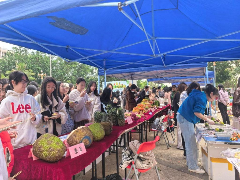 在热带园艺领域的深厚积淀与创新实力。智慧园艺、立体水培等前沿技术的展示,则描绘出现代农业的未来图景。水果品鉴区与蔬菜沙拉制作区人头攒动,新鲜的波罗蜜、番茄、火龙果等优品让师生们赞不绝口,实现了从“田间”到“舌尖”的美妙连接。“元气水果套圈派对”、“籽语寻踪”、“植物密码传递”等互动游戏,将园艺知识巧妙融入其中,欢声笑语不断,成为活动现场最具人气的焦点。落叶风铃、种子炸弹、干花书签、小花束制作等DIY活动,让同学们在动手创造中感受自然之美,一件件独具匠心的作品,承载着对美好生活的热爱与向往。精心布置的园艺主题秋千、繁花拱门、梦幻花伞以及意境深远的富贵竹盆景等展示区,构成了一系列绝美的打卡点,师生们纷纷驻足拍照,留下绚丽的记忆。
