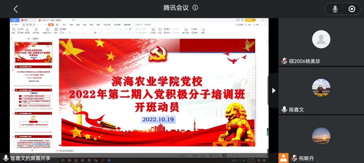 开班动员会上,陈嘉文强调了举办入党积极分子培训班是贯彻中组部发展党员工作细则需要、是提高入党积极分子自身素质、保证发展党员质量的需要。他提出要深刻认识举办入党积极分子培训班的重要性,要求全体入党积极分子要摆正学习态度,积极参加培训班学习,端正入党动机,深入学习和掌握党的基本知识,提高自身思想政治素养,保证发展党员质量。祝敏丹介绍了本期培训的目的、内容、课程、考核以及要求等。
